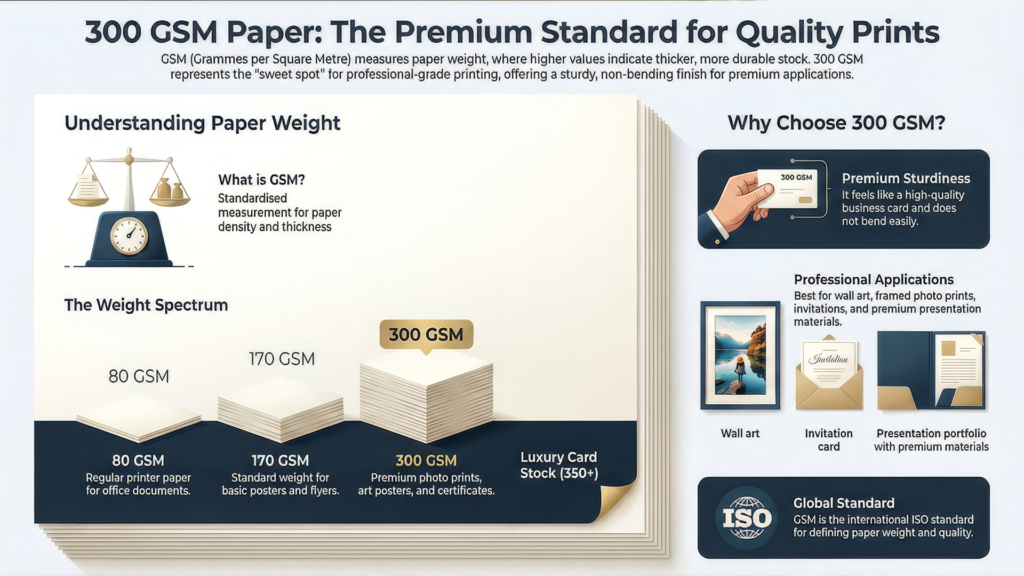 If you are planning to print premium photo prints or posters, you’ve probably seen the term “300 GSM paper.” But what does it actually mean? Is it thick enough for wall art? Is it better than 250 GSM?