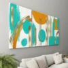 Featuring bold brush strokes in turquoise blue, warm orange, and shimmering golden accents, this artwork creates a stunning balance of modern design and rich sophistication.